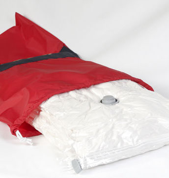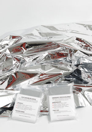 Fleece blankets packaged in a red bag with "URGENCE" marking